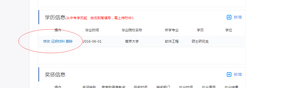 刷新后拖動(dòng)到學(xué)歷信息部分,可見新增的學(xué)歷信息如下顯示,點(diǎn)擊如圖1.1.2.6中的【修改】按鈕可修改選擇的學(xué)歷信息,點(diǎn)擊【刪除】即可刪除當(dāng)前學(xué)歷信息,點(diǎn)擊【證明材料】上傳學(xué)歷證明材料。