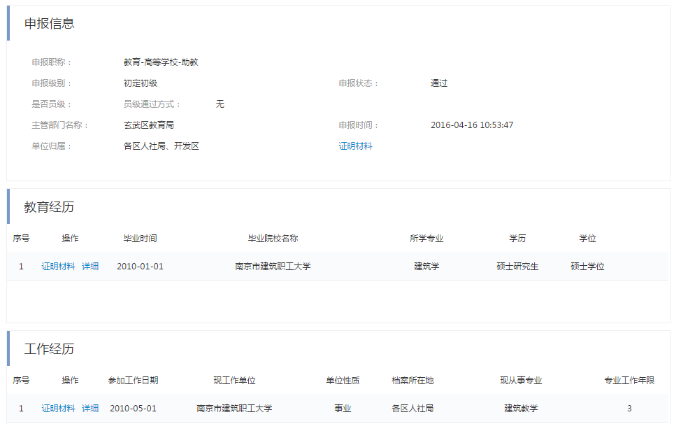 證明材料:點(diǎn)擊頁(yè)面上【證明材料】按鈕,可查看相關(guān)信息的證明材料,以教育經(jīng)歷為例,如下圖2.1.2.5所示。