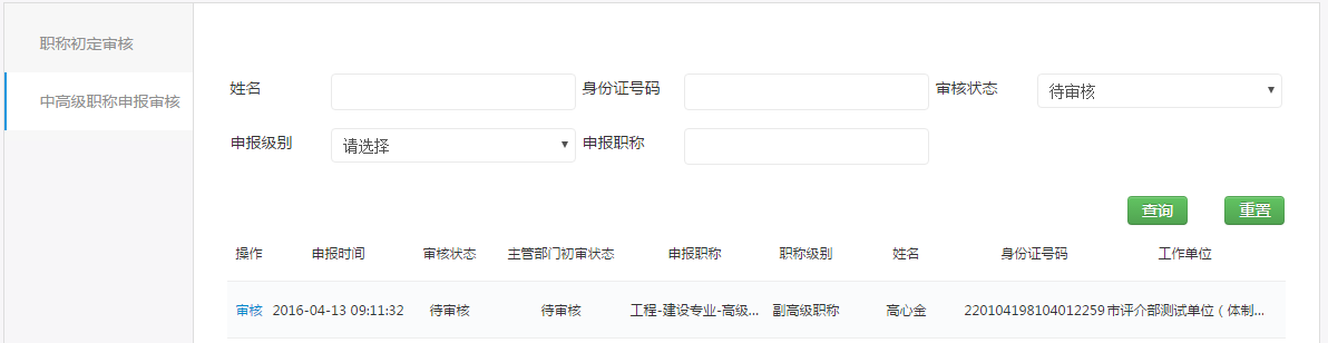 在“中高級(jí)職稱(chēng)申報(bào)審核”模塊,可見(jiàn)本單位申報(bào)人員信息,如圖2.2.2.1所示
